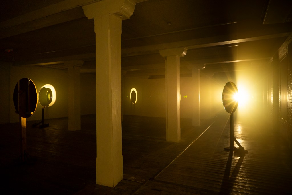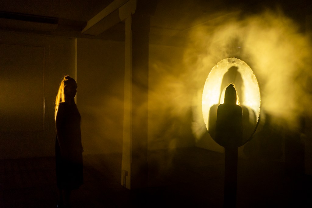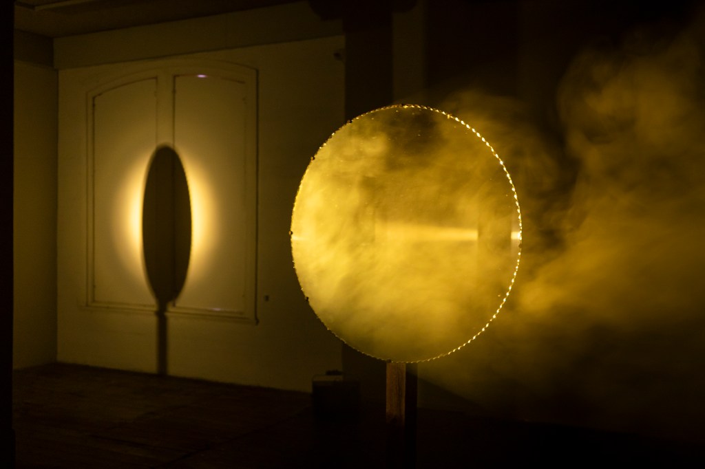 My work, horizon, symbolically reproduces the horizon using ordinary materials. The horizon summoned is two-fold: the planetary horizon, and also José Esteban Muñoz’s ‘queerness as horizon’ (2009), where the horizon is understood as futurity, and as a space of possibility, not yet here. With light, smoke and mirrors, horizon attempts to lend a tangibility and immediacy to both horizons, that are by nature, always out of reach. This immediacy prioritises the senses in favour of experience, and in the pursuit of a kind of understanding that might lie outside of empiric observation or abstracted philosophy – a kind of instinctive knowing. horizon contains repeated circular forms (the mirrors, the spot light, the shadows, etc) drawing connection to similar forms repeated at a cosmic level, and to the interconnectedness of all things. Reimagining these horizons using mirrors like that of my late Gran, I evoke the divine through the mundane, attempting to pull feelings that sit beyond my reckoning into the physical realm to experience, connect, understand, and to heal.